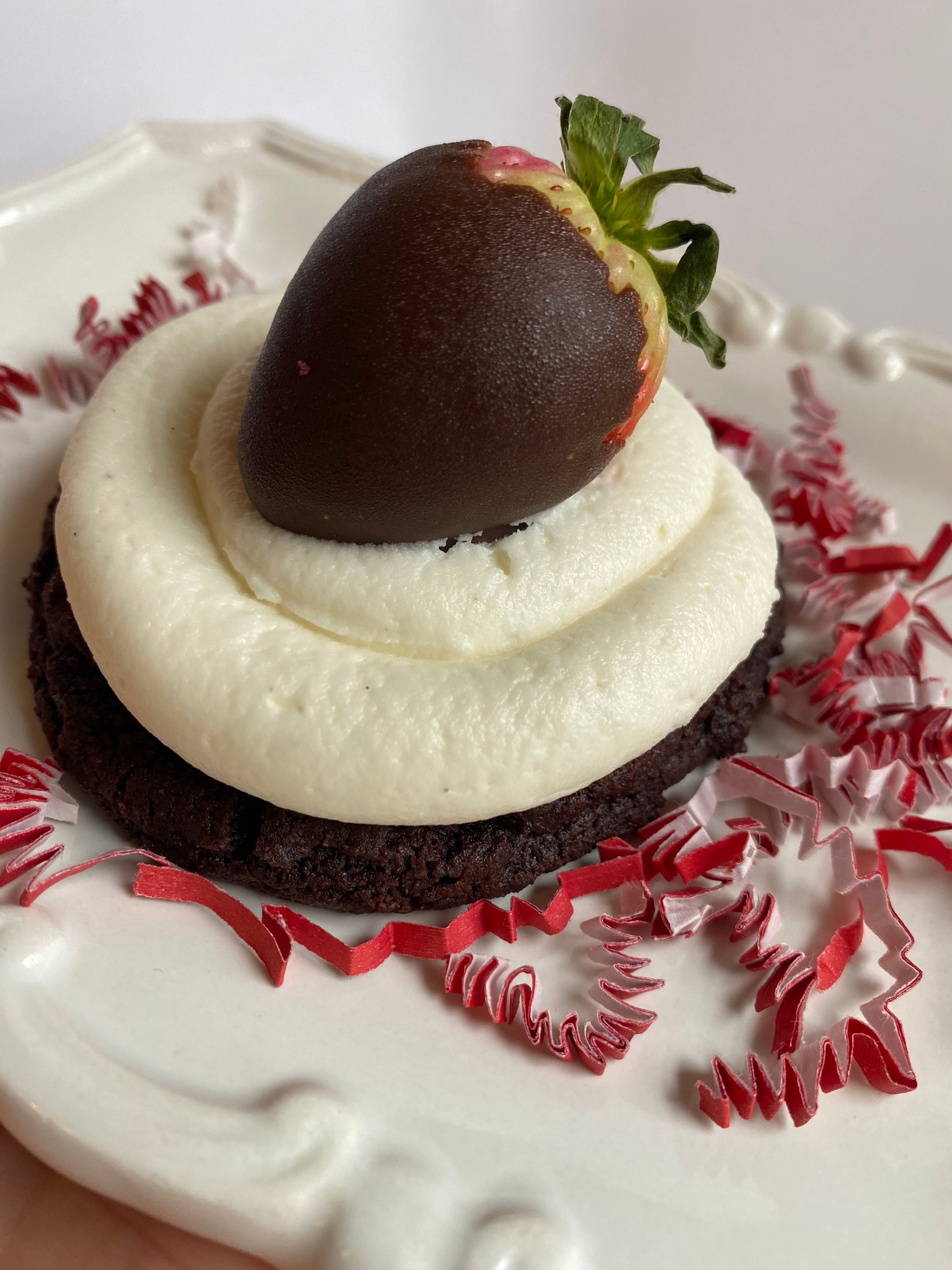 This decadent creation starts with a soft, fudgy chocolate or rich red velvet cookie base, topped with a swirl of creamy strawberry or cream cheese frosting, then crowned with a luscious chocolate-covered strawberry - just to make sure you feel the love in every bite! Perfectly balanced, wonderfully indulgent, and just a little bit extra — because you deserve it.